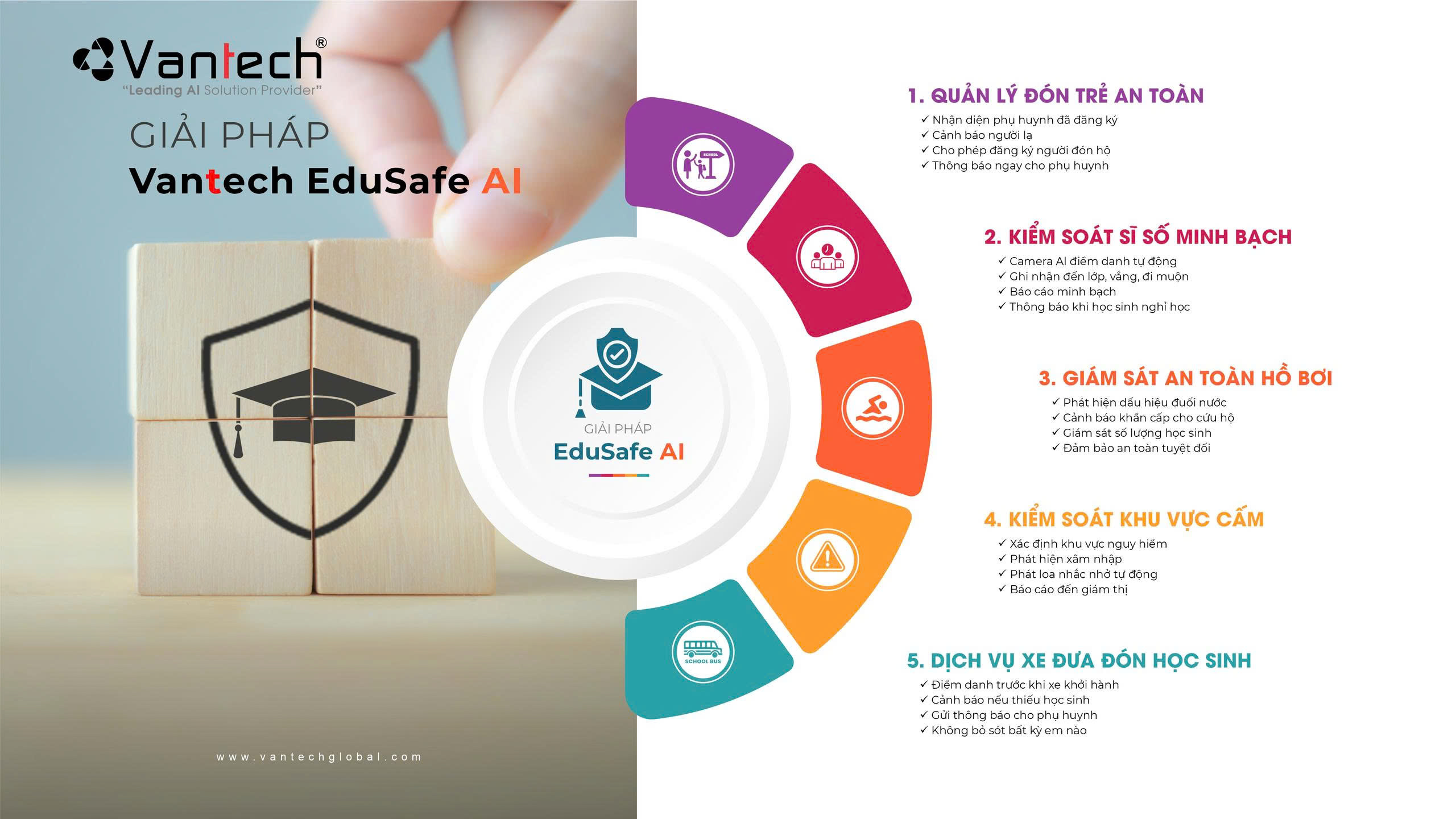 ✓ Giải pháp cho Trường học: Đảm bảo cho phụ huynh đón con tại cổng trường an toàn, phát hiện sớm các rủi ro về bắt cóc hay trộm cắp, điểm danh bằng AI, phát hiện hành vi bất thường, cảnh báo khu vực nguy hiểm, đảm bảo an toàn học sinh.