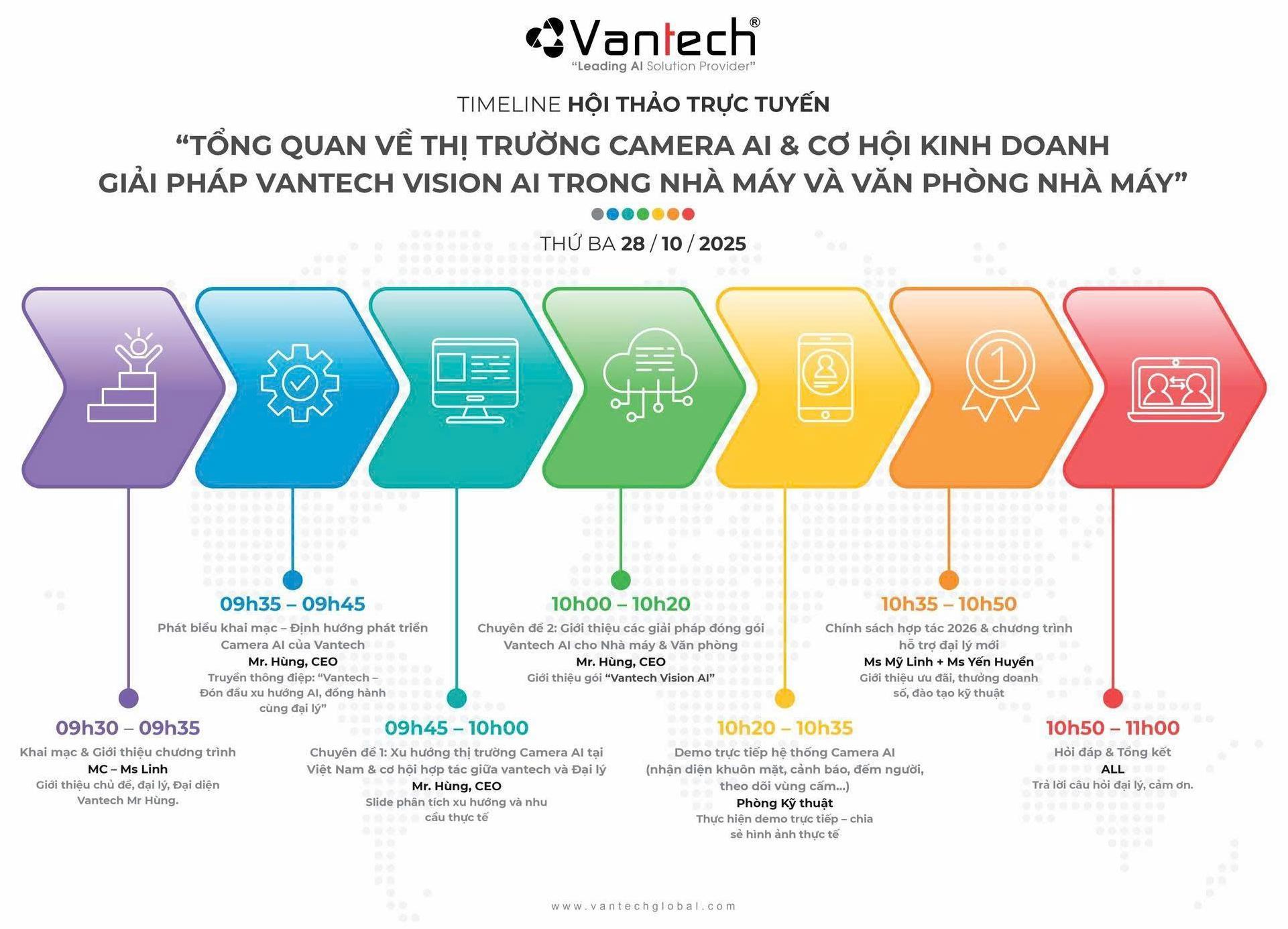TỔNG QUAN VỀ THỊ TRƯỜNG CAMERA AI & CƠ HỘI KINH DOANH GIẢI PHÁP VANTECH VISION AI TRONG NHÀ MÁY VÀ VĂN PHÒNG NHÀ MÁY Công ty Vantech tổ chức hội thảo trực tuyến với hệ thống đại lý phân phối trên toàn quốc, nhằm giới thiệu và chia sẻ các bộ giải pháp Camera AI được thiết kế chuyên biệt cho Nhà máy – Văn phòng – Trường học – Shop bán hàng.