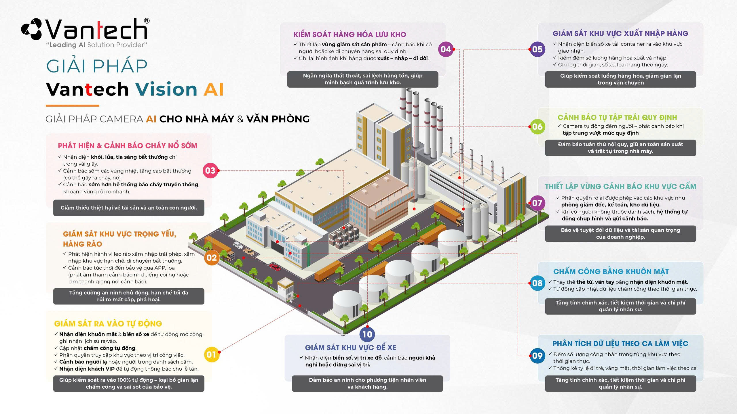✓ Giải pháp cho Nhà máy: Giám sát ra vào bằng nhận diện khuôn mặt và biển số, chấm công tự động, cảnh báo vượt rào, phát hiện sự cố an toàn, quản lý công nhân theo khu vực.